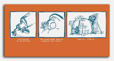 Creative Transition Resources Inc.CTR's "no bullshit" approach to dealing with corporate clients was their strength, their appeal. They wondered how to get this across to the kind of client who would relish this approach. They weren't interested in clients who couldn't manage a reality bite. We created a comic strip in which the corporate "astronomers" are focusing on a long-term image of future and excited by what they see - a short term fake. Inside, the CTR team is helping the employees pull away the false front. Back to Brochures. Back to the Portfolio.