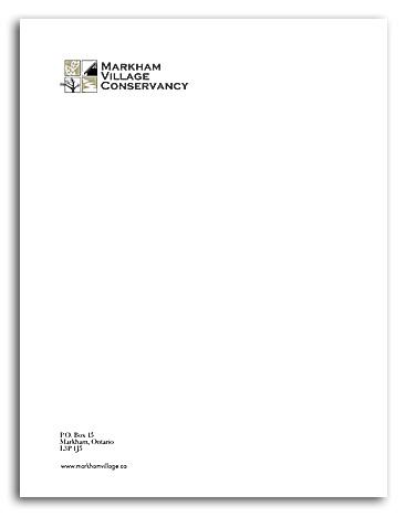 Markham Village ConservancyThe conservancy had nearly completed their first big project, when they realised that they needed to change their name and their look. They decided they were going to continue to work to conserve Markham Village's heritage and natural areas. And so needed a more encompansing image. This stationery and their new logo was the result. Back to Stationery Back to Portfolio |